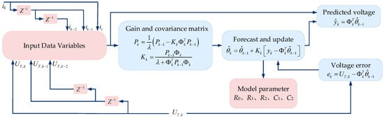 where denotes the estimated value of the parameter at the previous moment, denotes the observed value at the current moment, denotes the actual observed value at the current moment, denotes the gain term, and the revised value of the predicted value at the current moment is the product of the expected error and the gain term, while the final estimate is the sum of the revised value of the predicted value at the current moment and the estimated value at the current moment, and is the forgetting factor. In general, the forgetting factor takes a range of values , the size of , which affects the algorithm tracking ability. The flowchart of FFRLS identifying parameters is shown in Figure 3.