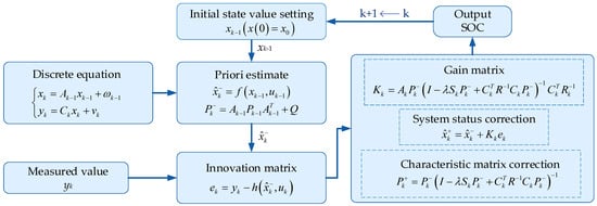 To better distinguish the estimation results obtained before and after the update, is used to denote the value of after the time update, is used to denote the value of after the time update, is used to denote the value of after the measurement update, and is used to denote the value of after the measurement update. The flowchart of this algorithm is shown in Figure 4.