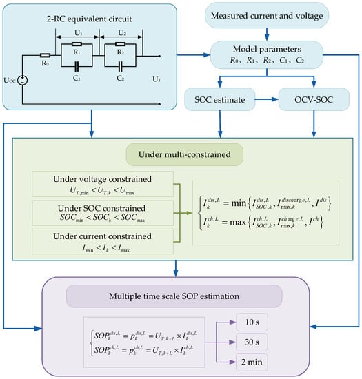 In this paper, a second-order RC equivalent circuit model is established, and the forgetting factor recursive least squares (FFRLS) is used to identify the parameters of the battery equivalent circuit model. Not considering the initial value of the system, the H∞ filtering algorithm is used to estimate the SOC. Furthermore, a multi-time scale SOP estimation method with voltage, current, and SOC as constraints is proposed to improve the accuracy of SOP estimation.