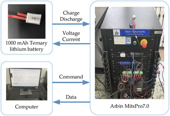 In this paper, a ternary lithium–ion battery with a rated capacity of 1000 mAh is used as the experimental object. As shown in Figure 6, the test platform consists of the host computer, the battery under test, and the battery test system of ArbinMitsPro7.0 to conduct the following experiments.