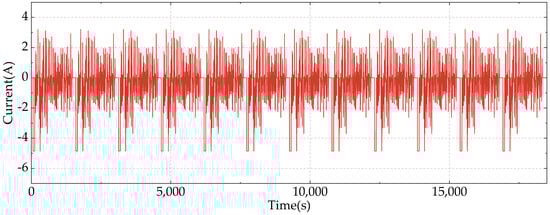 - Input the UDDS working condition excitation current (as shown in Figure 7) into the battery test system to conduct the cyclic working condition test until the terminal voltage of the tested object is less than 2.75 V and stop discharging, and collect the experimental data.