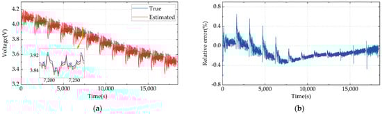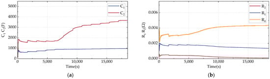 As for C1 and C2 in the previous stage of identification, the circuit model parameters change more significantly due to the differences in the selection of the initial values of the model parameters and the large deviations caused by their initial values. Moreover, the values of each parameter gradually stabilize as the identification process continues. Therefore, as can be seen from Figure 9, even if the given initial values are inaccurate, the FFRLS algorithm can still correct each parameter in time, so that the parameters converge rapidly to approach the true value and remain stable. The five parameters are iteratively updated in real time according to the UDDS operating data, so that the battery model can be transformed into a time-varying system. Thus, the self-adaptation of the battery model parameters is achieved and the estimation accuracy of the battery state is improved.