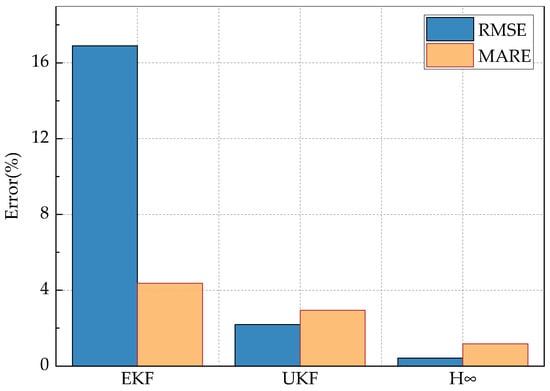 In order to verify the accuracy of estimation by the algorithm proposed in this paper, three mathematical indicators, namely, relative error (RE), mean absolute relative error (MARE), and root mean square error (RMSE), are used to evaluate the joint estimation performance of SOC–SOP.