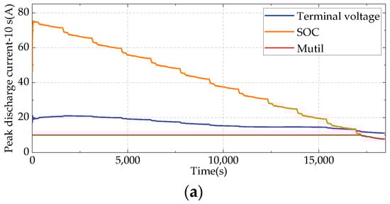 By combining the above two constraints and considering the design limits of the Li–ion battery itself (peak discharge current and peak charge current ), the sustained peak charge and discharge current with multiple constraints can be obtained: