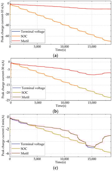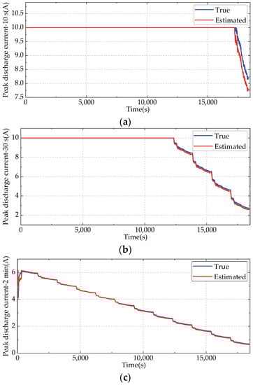 Results of multi-constraint peak charge current estimation in different time scales: (a) 10 s; (b) 30 s; (c) 2 min.