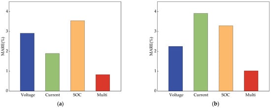 As the SOP of the lithium–ion battery reflects the charging/discharging capacity of the battery, its accurate estimation can not only provide guidance on how to use the battery rationally and ensure the optimal power distribution, but also avoid the overcharging and overdischarging of the battery and extend the service life of the lithium–ion battery. From Table 1 and Table 2, it can be seen that the SOP estimation error increases with the increase in time scale, with the acceleration, climbing, and braking energy recovery process of the electric vehicle completed in a period of time. Therefore, it is necessary to consider the time scale for the accurate SOP estimation. Figure 21 shows the comparison of the relative error of the average absolute value of SOP estimation under different constraints at the time scale of 30 s. It can be seen from this figure that only a single constraint leads to overcharge and overdischarge of the battery, and the battery SOP is constrained by the common constraints of voltage, current, and SOC. Moreover, the three constraints work alternately at different stages of the charging/discharging process, and the multi-constraint SOP estimation MARE does not exceed 1.1%. In the extreme SOC state of the battery, there is a risk of overcharging and overdischarging for the battery, and the SOC limit is dominant at this stage. For this reason, the H∞ filter algorithm with evident estimation accuracy advantage as described in Section 4.3 is used for SOC estimation, and the result of this estimation is taken as a constraint for SOP estimation. The results listed in Table 1 and Table 2 show that the MARE of SOP estimation is less than 1.6% and the RMSE is less than 2.3 W.