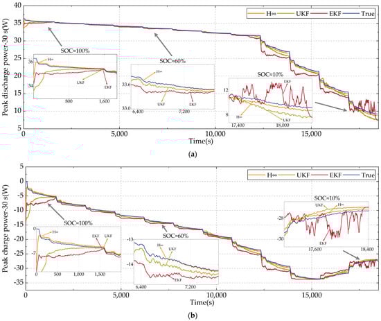 It can be seen from the SOP calculation process in Section 3.2 that the prerequisite for calculating SOP is to calculate the peak current. The SOP value in the current time scale can be obtained by multiplying the calculated peak current and the battery terminal voltage. The peak current based on voltage constraint and SOC constraint and the terminal voltage of the battery are calculated based on the current SOC of the battery. It can be seen that the accuracy of SOC estimation is important for SOP estimation. In order to evaluate the convergence and performance of the proposed method, the EKF algorithm, UKF algorithm, and H∞ algorithm are used to jointly estimate SOC–SOP under the condition that SOC has a large initial error. Figure 22 shows the comparison diagram of charging and discharging SOP estimation based on the H∞, UKF, and EKF algorithms to estimate SOC at a 30 s time scale. From the partial enlargement of Figure 22, it can be seen that the joint SOC–SOP estimation based on the H∞ algorithm can accurately estimate the SOP in the high, middle, and low SOC intervals. The accuracy of the SOP estimation depends largely on the accuracy of the SOC estimation. When the SOC estimation does not converge, the result of the SOP estimation does not converge. From the initial stage of estimation in Figure 22, it can be seen that the given initial value of SOC has a large error, resulting in a large error in SOP estimation. With the rapid convergence of SOC under the H∞ algorithm, SOP also converges rapidly. It can be seen that the convergence of SOC affects the convergence of SOP. From Table 3, we can see that the convergence time of joint SOC–SOP estimation based on the H∞ algorithm is less than 100 s, and its effect is far greater than that of joint SOC–SOP estimation based on the EKF algorithm or the UKF algorithm.