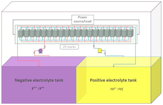 A commercial VRB system should be able operate over a wide range of climates with temperature ranges between −5 °C to 45 °C. On the other hand, the stack and electrolyte temperatures need to be maintained between 10 °C and 40 °C to prevent precipitation in the electrolytes and blockages in the stacks and pipes. A containerised system is not directly exposed to the ambient temperature, so the air temperature inside the container would be easier to control. For studies of thermal design options, a simple temperature threshold-based logic control strategy for the cooling system is considered here to maintain a normal operating temperature range. The simplest way for cooling is to use fans, which are of low costs and easy to maintain. The schematic diagram for a containerised VFB system is shown in Figure 2.