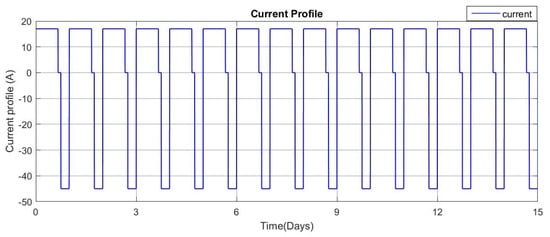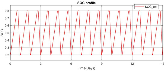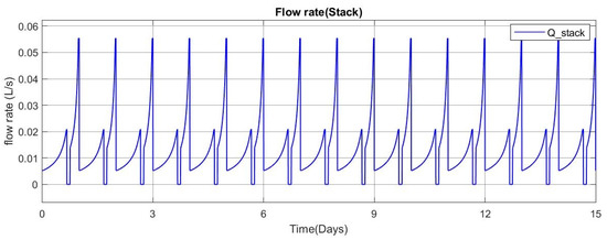 For each simulation, the discharging and charging currents are set as 45 A and 17 A, respectively and the battery is operated between 20% to 80% state of charge (SOC). The current profile, SOC response as well as flow rate profile of each stack for a 15-day simulation are shown in Figure 3, Figure 4 and Figure 5.