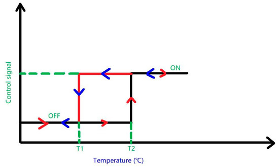 The objective of this scenario is to obtain the temperature response for a containerised 20-stack 30 kW/130 kWh VRB system with no insulation when the ambient temperature varies from 15 °C to 35 °C. In order to make the whole system operate normally, hysteresis control-based cooling strategies are applied to prevent frequent temperature switching. Its working principle is shown in Figure 6, where T1 and T2 are fans turn-off and turn-on threshold temperature, respectively.