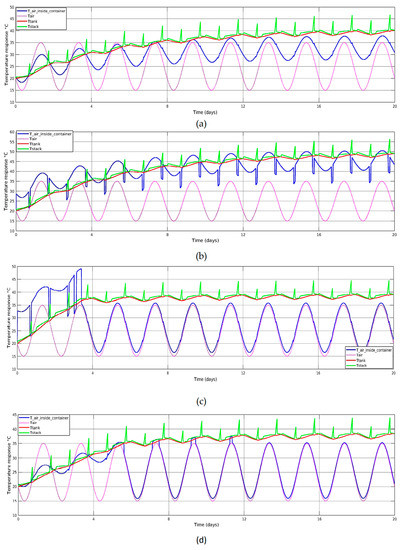 The simulation results for ambient temperature (), stack temperature (), tank temperature () as well as air temperature inside the container () are shown below: