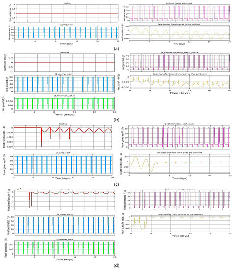 Figure 8 illustrates the heat generation and transfer in Figure 7a–d, which clearly shows the heat generation of fans, pumps and inverters, as well as the heat carried by the fans. As shown in Figure 8, heat transfer becomes faster when fans operate, whereas heat transfer from inner air to ambient becomes slower with insulation. As pumps and stack resistance produce much less heat than inverters, the heat generated by inverters can increase the rate at which heat is transferred from the internal air to the atmosphere because the heat generated by inverters directly contributes heat to the internal air and causes larger temperature differences between internal air temperature and ambient temperature. Inverters and pumps are not functioning during stand-by, but fans are still working, so the internal air temperature decreases, resulting in a decrease in the temperature difference between the internal and ambient air temperatures, which ultimately reduces heat transfer rate between them. Dynamically stable heat transfer rates are also observed at steady states in Figure 8. Charging and discharging result in inconsistent ohmic heating since stack resistance and current differ.