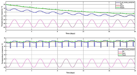 Due to relatively low ambient temperature, it is not necessary to apply cooling strategies if there is no insulation material applied. As mentioned in the normal summer scenario, it is better to isolate inverters from other parts of the container for efficient summer operation. Thus, exploring temperature response of important components inside the container when the insulation material as well as the cooling strategy are applied, and inverters are isolated from the inner environment of the container becomes very crucial. Based on these conditions, Figure 9 shows that when tank temperature reaches more than 35 °C, the tank temperature minus air temperature inside the container is greater than 2 °C and air temperature is greater than ambient temperature, fans will be switched on, while fans will be closed once the tank temperature drops below 25 °C or other situations. Furthermore, in this case, the temperature of the tanks will be between 25 °C and 35 °C after it reaches 35 °C for the first time and the average temperature of tanks will be eventually maintained at approximately 30 °C. Therefore, temperature of tanks and stacks can be well controlled to be within the safe operation range by using this cooling strategy for this normal winter case.