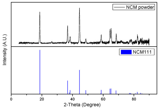 The cathode materials of spent lithium batteries were used in this study. To ensure safety, the spent lithium batteries (NCM111) were fully discharged in a saturated NaCl solution for 24 h. After that, they were manually disassembled and separated to extract the ternary cathode material. Using a crusher and sieving (80-mesh) can reduce the contents of aluminum, which is an impurity in cathode materials during the leaching process, because it avoids chunks of aluminum foil being incorporated easily. Table 1 lists the main metal contents of the cathode materials of spent lithium batteries. Given that the contents of aluminum and iron were quite low, the influence on the leaching procedure was deemed negligible. Figure 1 illustrates the results of the XRD analysis, showing that the major peaks of NCM powder at 18.683°, 36.723°, and 44.463° confirm the presence of crystalline NCM111 (LiNi0.33Co0.33Mn0.33O2) as the dominating phase. Analytical grade chemicals were obtained from Echo Chemical Co., Ltd., Miaoli, Taiwan, and all aqueous solutions were prepared using deionized water.