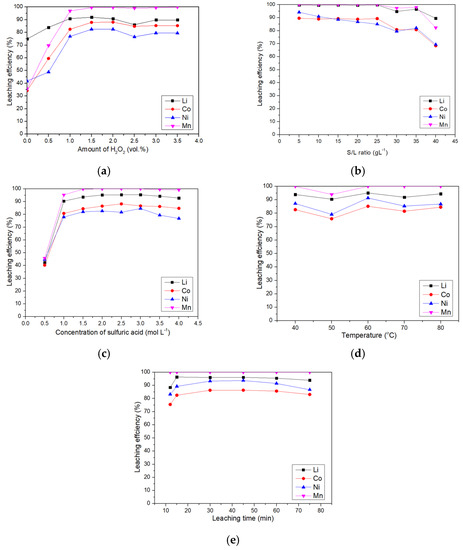 Effect of (a) amount of H2O2 added, (b) S/L ratio, (c) acid concentration, (d) temperature, and (e) time on leaching efficiency of sulfuric acid.