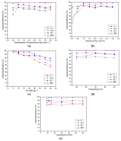 Effect of (a) acid concentration, (b) amount of H2O2 added, (c) S/L ratio, (d) temperature, and (e) time on leaching efficiency of hydrochloric acid.