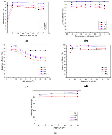 Effect of (a) amount of H2O2 added, (b) acid concentration, (c) S/L ratio, (d) time, and (e) temperature on leaching efficiency of nitric acid.