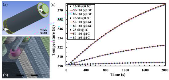 The mesh generation and quality can influence the accuracy of the numerical results [48]. The meshing software used in this study is also ANSYS® Fluent. Figure 2c shows the simulation results of different mesh element sizes at three discharging rates (0.3 C, 0.6 C and 1 C). For the legend “Mesh N1-N2 @ 0.3 C”, N1 refers to the mesh division number of anode tab perimeter (40.84 mm) as shown in Figure 2a. When division numbers N1 = 25, 50 and 80, the lengths of each division are 1.63 mm, 0.82 mm and 0.51 mm, respectively. N2 refers to the mesh division number of cathode tab perimeter (65.97 mm) as shown in Figure 2a. When division numbers N2 = 50, 100 and 160, the lengths of each division are 1.32 mm, 0.66 mm and 0.41 mm, respectively. “@ 0.3 C” refers to the discharging rate is 0.3 C. The mesh numbers of nodes/elements at different N1-N2 of 25–50, 50–100 and 80–160 are 20353/18268, 105589/99025 and 329047/314304, respectively.