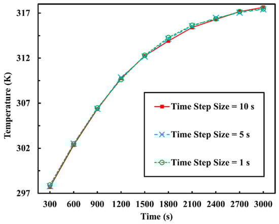 In addition to the mesh independence study, time step size independence study had also been conducted in this research. In numerical calculations, small time step size usually means more calculation iterations, leading to longer calculation time and more computational resources. However, although large time step size could save calculation time and resources, it is usually not convergent, and its results could be inaccurate. The purpose of time step size independence is to find out the maximum yet most suitable time step size to obtain accurate simulation results at the costs of relatively lowest computational resources. In this study, three different time step size are selected: 10 s, 5 s and 1 s. The results are shown in Figure 3. All three time step size results almost coincide with each other completely, showing the required convergent value which represents the highest accuracy. On the other hand, the total calculation time of 1 s time step size simulation is almost ten times longer than the 10 s time step size one. As a result, 10 s has been selected as the universal time step size for all the numerical simulations in this research.