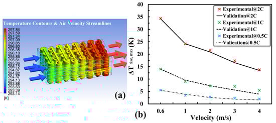 (a) Simulation results of the battery surface temperature contours and air velocity streamlines during 0.5 C discharging with 4 m/s inlet air velocity at 293.15 K (20 °C); (b) The comparison between the simulation results and the experimental data in Ref. [49].