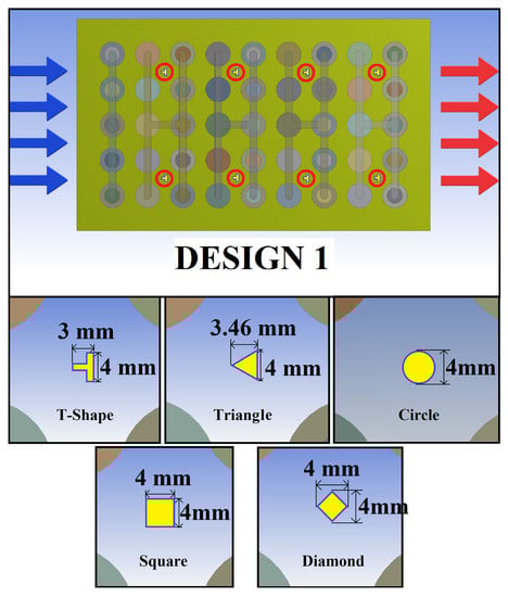 The T-shape VGC contour shape is one of the major innovations in this study. To find out the optimal contour shape, the cooling performances of the basic Design 1 with different contour shape VGCs are investigated. The proposed VGC contour shapes include T-shape, triangle, circle, square, and diamond as shown in Figure 5.