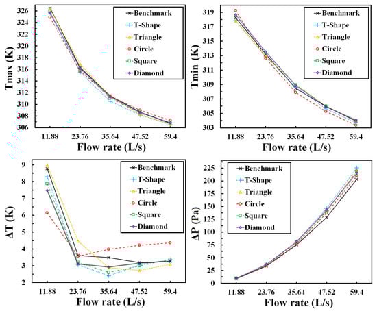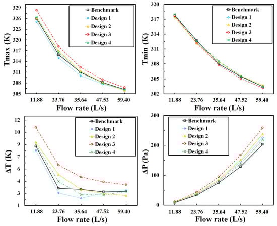 It can be observed that not all the VGC designs performed better than the conventional design. The Tmax values of the conventional design rank 2nd, 2nd, 3rd, 4th and 3rd among all five designs at all five flow rates, respectively. The ΔT values of the conventional design rank 2nd, 2nd, 4th, 4th and 4th among all five designs at 11.88–59.40 L/s. For the criteria of the Tmax (<308.15 K) and ΔT (<5 K), Design 1 reached the minimum Tmax (307.69 K) and qualified ΔT 2.55 K at 47.52 L/s, outperforming the conventional and all other VGC designs. The Tmax and ΔT of Design 1 are 0.46 K and 0.13 K lower than those of the conventional design with a negligible ΔP increase in 17.88 Pa. As a result, Design 1 could be regarded as the optimal design in this group.