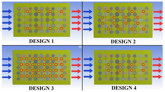 After the optimal contour shape is decided, the optimal distribution of the VGCs in the battery pack will be explored in this section. Based on the conventional air-cooling BTMS design without any VGC, four derivative designs with different VGC distributions including the basic Design 1 are proposed in Figure 7. Since the VGCs are quite small compared with the whole battery pack in true scale, the positions of the VGCs in each design are highlighted in the small red circles. Design 1 has 8 VGCs on the intersection points of the 2nd, 4th, 6th and 8th clearance columns and the 1st and 4th clearance rows. In addition to Design 1, Design 2 has 8 more VGCs (16 VGCs in total) on the intersection points of the 1st, 3rd, 5th and 7th clearance columns and the 2nd and 3rd clearance rows. Design 3 has 32 VGCs on all the intersection points of every clearance column and row. Design 4 has 8 VGCs on the intersection points of the 2nd, 4th, 6th and 8th clearance columns and the 2nd and 3rd clearance rows.
