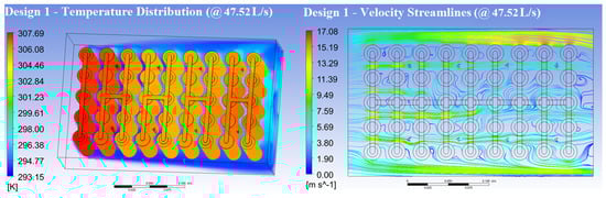 Temperature distribution volume rendering and velocity streamlines of Design 1 at 47.52 L/s.