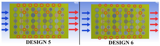 Two rows of additional L-shaped VGCs are added in the bilateral clearances in Design 5 and 6 to solve the problem of the surplus accumulations of the wasted air flow streamlines on the bilateral clearances as shown in Figure 10. The additional VGCs in Design 5 are aligned parallel to the case walls while those in Design 6 have a small inclination angle (2°) with the walls to create a convergent cooling channel along the air flow direction from inlet to outlet.