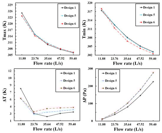 The simulation results of Design 1, 5 and 6 are shown in Figure 11. At 11.88 L/s, the Tmax values of Design 5 and 6 are 1.53 K and 1.43 K lower than Design 1. Moreover, the ΔT values of Design 5 and 6 are 2.1 K and 2.06 K lower than Design 1, showing a significant improvement in the cooling performance by adding the bilateral VGCs at low air flow rate. However, when the flow rates are increased to 35.64 L/s or over, Tmin values of both Design 5 and 6 are becoming lower than those of Design 1 and Tmax values are higher than Design 1, leading to much worse ΔT performances of the bilateral VGC designs at higher flow rates.