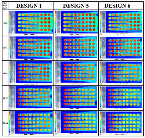 As a more visually perceptible explanation to the simulation results, the temperature patterns of Design 1, 5 and 6 at all flow rates are shown in Figure 12. In all figures, the inlets are on the left-hand side and the outlets are on the right-hand side. It can be generalized that the temperature distributions of all three designs are following some shared patterns: (a) cell temperatures range from low to high along the air flow direction at low flow rate (11.88 L/s); (b) cell temperatures range from high to low along the air flow direction at high flow rates (47.52 L/s and 59.40 L/s); (c) cell temperature distributions are more uniform at medium flow rates (23.76 L/s and 35.64 L/s).