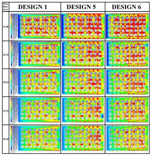 To find out the influences of the TEF values on the temperature performances, the TEF patterns of Design 1, 5 and 6 at all flow rates are shown in Figure 13. Different TEF patterns mainly attribute to the battery pack internal structures. Although there are two more rows of bilateral VGCs in Design 5 and 6, the general TEF patterns of all these three designs are similar: the TEF values range from low to high along the air flow direction at all flow rates. The additional parallel bilateral VGCs in Design 5 could boost the gradient degree of the TEF patterns while the convergent bilateral VGCs in Design 6 could further enhance the gradient degree of the TEF patters as shown in Figure 13. Since all the legends are unified with same TEF ranges at each flow rate (0–1000 at 11.88 L/s, 0–2000 at 23.76 L/s, 0–3000 at 35.64 L/s, 0–4000 at 47.52 L/s and 0–5000 at 59.40 L/s), it can be observed that the consequence of the average TEF values is “Design 6 > Design 5 > Design 1”. When the flow rate is low (11.88 L/s), the cells with the higher temperatures are close to the outlet as shown in Figure 12. The higher TEF values of Design 5 and 6 effectively cool down these cells near the outlet and reduce both Tmax and ΔT values, leading to the cooling performance improvement of the bilateral VGC designs at low flow rate. However, when the flow rates are increased to 35.64 L/s or higher, the cells with lower temperatures are mostly distributed closer to the outlet as shown in Figure 12. The higher TEF values of Design 5 and 6 could further reduce the temperatures of these colder cells, adversely augmenting the temperature differences between the cells near the inlet and outlet. As a result, the bilateral VGC designs are only effective to improve the cooling performance at lower flow rates (11.88–23.76 L/s) and not beneficial to the cooling performances (especially the ΔT values) at higher flow rates (35.64–59.40 L/s).