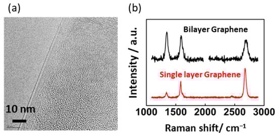 Figure 1. (a) Transmission electron microscopic image of bilayer graphene. (b) Raman scattering spectra of the graphene electrodes. Single-layer and bilayer graphene are represented by red and black curves, respectively.
