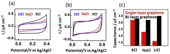 Figure 2. Cyclic voltammograms of LiCl (blue), NaCl (red), and KCl (black) aqueous solutions on (a) single-layer graphene and (b) bilayer graphene electrodes. (c) Capacitances of KCl, NaCl, and LiCl aqueous solutions on single-layer (red) and bilayer graphene (black) [33]. Copyright © 2020, American Chemical Society.