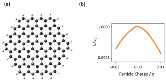 Figure 3. (a) Model graphene fragment for Hartree–Fock calculations. Carbon and hydrogen atoms are represented by black and white spheres, respectively. CC and CH bonds are represented by a black stick. (b) Relative stability of graphene with partial charges when E0 is set to the graphene stability at neutral charge.