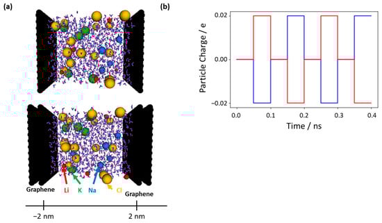 Figure 4. (a) Snapshot of aqueous electrolytes between single-layer graphene and bilayer graphene. Li, Na, K, and Cl ions are represented by red, blue, green, and yellow spheres, respectively. O and H atoms in H2O are illustrated by blue and red sticks, respectively. A carbon atom is represented by a large black sphere. (b) Conditions of the applied partial charges (±0.02 e) of carbon atoms on the right- and left-side graphene.