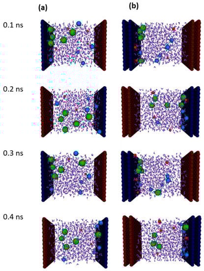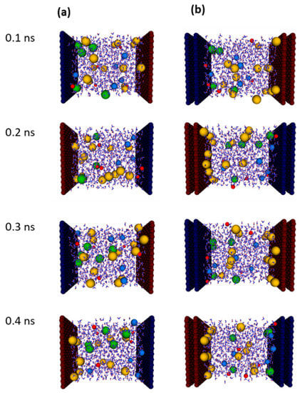 Figure 5 shows snapshots of aqueous electrolytes during charging at 0.1, 0.2, 0.3, and 0.4 ns. Ions are adsorbed on the oppositely charged graphene with a carbon partial charge of ±0.02 e, especially on bilayer graphene. Positive and negative ions were attracted to the negatively and positively charged graphene, respectively, whereas water was dispersed between the graphene. In particular, K and Cl ions relatively quickly moved to the oppositely charged graphene, whereas Li and Na ions gradually moved to the oppositely charged graphene. This can be attributed especially to the formation of a strong ion pair of small ions such as Li and Na ions with Cl ions, and the anomalous ion pair formation was probably caused by the small dimensions of the simulation box in comparison with the actual system [6]. Although it is much better to observe ion dynamics using huge simulation box at the micrometer level, it is severely time-consuming to obtain enough statistical data from small numbers of ions. The same MD simulation without the Cl ions was therefore conducted to avoid unexpected ion pair formation in MD simulations.