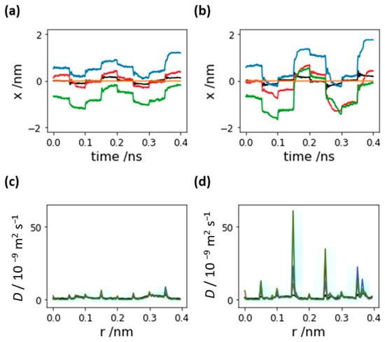 Figure 7. Average ion and water positions over time in the case of (a) single-layer graphene and (b) bilayer graphene. Self-diffusion coefficients in the case of (c) single-layer graphene and (d) bilayer graphene. Li, Na, and K ions, and H2O are represented by red, blue, green, and black curves, respectively.