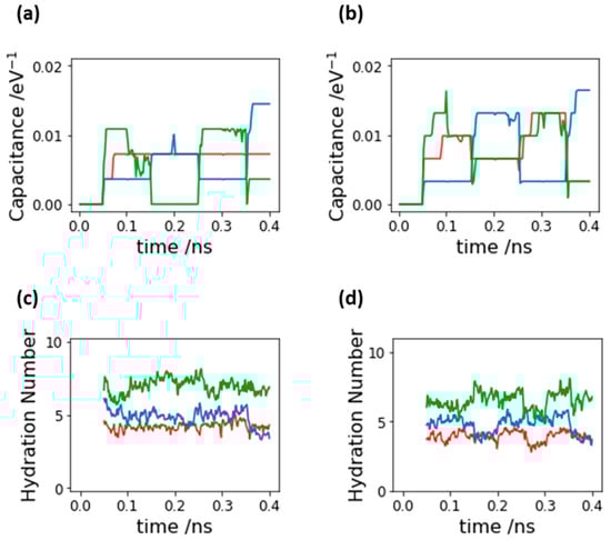 The capacitances were calculated based on the number of adsorbed cations on the oppositely charged graphene (Figure 8a,b). The capacitances were considerably maintained even during the discharging cycles between 0.10–0.15, 0.20–0.25, and 0.30–0.35 ns, especially for Li ions. The maintenance of the capacitances was in good agreement with the rectangular shape of the experimentally obtained cyclic voltammogram shown in Figure 2a,b. A higher capacitance was observed in the case of K ions on the single-layer graphene than in the cases of Li and Na ions, except for the last cycle between 0.35 and 0.4 ns. In contrast, the capacitances for all ion species on bilayer graphene were similar. These results were also in good agreement with the experimental capacitances. A partial charge of ±0.02 e per a carbon atom induced stronger potential fields of bilayer graphene than single-layer graphene, and ion transfers in the bilayer graphene were faster than single-layer graphene, as mentioned above. The maintenance of the capacitance is probably a result of the hydrogen bonding network of water preventing an ion from having high mobility [39]. The self-diffusion coefficients were slightly increased when the partial charges of carbon atoms were switched to neutral at 0.10, 0.20, and 0.30 ns, as mentioned above in Figure 7c,d. On the other hand, the high self-diffusion coefficients at 0.05, 0.15, 0.25, and 0.35 ns, when the partial charges were switched to ±0.02 e, induced a rapid ion transfer and resulted in high capacitances. The high mobility of hydrated ions at charging is a result of hydrated water molecules participating in ion transfer and quick exchange between hydrogen bonding and hydration forms, reported elsewhere [39]. The changes in the hydration structure during the charging and discharging cycles were evaluated based on the hydration numbers shown in Figure 8c,d. The hydration numbers of the Li, Na, and K ions were 4, 5, and 7, respectively [25]. The hydration numbers of the Li and Na ions slightly changed during the charge–discharge cycles in the case of the single-layer graphene. However, the hydration numbers of the K ions exhibited a considerable change compared to those of the Li and Na ions. The changeable hydration numbers of the K ions were caused by their weak hydration. In contrast, the hydration numbers of all the ion species obviously changed in the case of the bilayer graphene, inducing similar capacitances on bilayer graphene. Thus, decreasing hydration numbers, i.e., dehydration, is necessary to gain high capacitances on graphene electrodes.