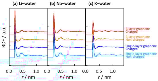 The radial distribution functions between Li and water, Na and water, and K and water were calculated to assess the hydration shell during charging and non-charging cycles (Figure 9). The peak intensities were standardized by molecular numbers in systems. The nearest-neighbor distances between the Li ion and water, the Na ion and water, and the K ion and water were 0.2, 0.24, and 0.27 nm, respectively, regardless of the state of charging or non-charging for both single-layer and bilayer graphene. This indicated that hydration was obviously formed in all the systems and the strength of hydration could be estimated by the peak height because a high peak indicated a rigid hydration structure. The strength of hydration was determined from the above point: Li ion > Na ion > K ion, as expected. On the other hand, the second-nearest neighbor distances were changed by the layer number of graphene and charging. The second-nearest neighbor distances in the case of the bilayer graphene were longer than those in the case of the single-layer graphene regardless of the state of charging or non-charging. The second-nearest neighbor distances of Li-O and Na-O were rarely changed by the layer number of graphene and the state of charging and non-charging; the Li-O and Na-O distances were 0.45 ± 0.01 and 0.50 ± 0.01 nm, respectively. On the other hand, K ion–water distributions were considerably changed by those conditions. The second-nearest neighbor peak for the single-layer graphene and the state of non-charging was clearly observed at 0.50 nm, whereas the peak for the single-layer graphene during charging was broadened. Those for the bilayer graphene were hard to observe regardless of charging and non-charging. Those results of K ions indicated the formation of a weak hydration shell, and K ions hardly affected the second- and higher-nearest neighbor structures. A weakened hydration structure for bilayer graphene promoted a fast transfer during charging, which is associated with high capacitances, as similarly mentioned above in Figure 8c,d, which became the advantage of higher capacitances.