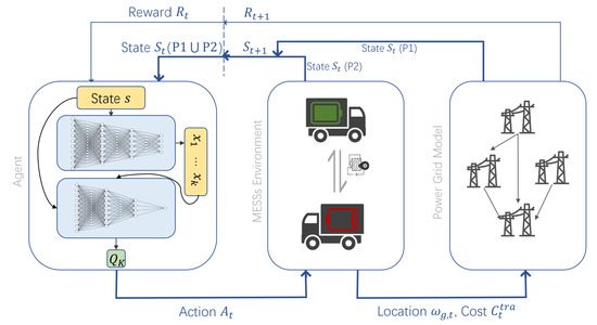 Recently, deep reinforcement learning (DRL) techniques have seen growing applications in battery management [25,26], grid management, and micro-grid management [27,28]. The authors of [25] presented a DRL-based method for a battery system in EVs, which consisted of a high-power battery pack in order to reduce energy loss and enhance thermal safety. The proposed strategy demonstrated advantages in terms of reducing calculation time and energy consumption. In [26], the researchers proposed a joint optimization framework of DRL and binary integer programming for the battery swapping–charging systems for EVs, which had favorable performance in a real-time demonstration, as well as improved computational efficiency and privacy preservation. A multi-agent system based on an RL method was applied to manage a stand-alone micro-grid including a power-production unit, a power-consumption unit, and a power-storage unit in [27]. The authors of [28] proposed an optimal control strategy based DRL, which had asynchronous advantages via its framework to manage and optimize an online energy system.A multi-agent DRL-based approach was developed by [29] for real-time route selection and dispatching of multiple coordinated MESSs, and it had the ability to handle a hybrid continuous-discrete action space and to strengthen resiliency after extreme events. In [30], the researchers proposed a DRL-based method that coordinated the scheduling of the MESSs and the resource allocation of micro-grids in order to minimize the overall cost of the system. In the future, a significant amount of data is expected to be generated in the fields of energy and transportation [19], which could provide significant data support for solving MESS’s challenges through the application of DRL-based methods.