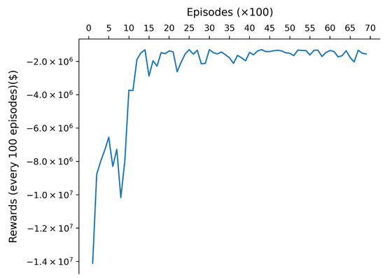 Figure 2 depicts the convergence of the cumulative rewards achieved by the proposed DRL-based algorithm during the training phase. The x-axis represented the number of iteration rounds, with each increment on the axis representing 100 iterations. The y-axis displayed the accumulated cost, which was presented as a negative value. The graph demonstrated that the training reached convergence after approximately 1500 iterations. The training process was approximately 5 h for 7000 iterations, whereas the execution time of the trained network was virtually insignificant. By utilizing a trained network, we observed a significant improvement in computational efficiency.