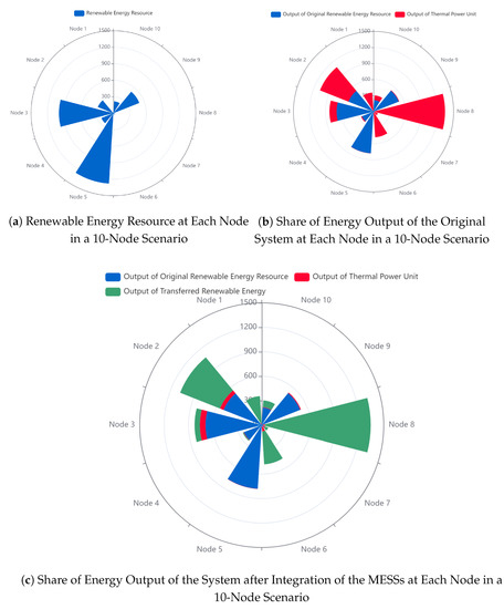 Figure 3c presents a polar plot that displays the optimal energy distribution among various nodes. The blue, red, and green segments in the plot depicted the local renewable energy sources, the energy generated by thermal units, and the energy transmitted through the MESSs, respectively. As shown in the plot, certain nodes, such as nodes 5 and 9, possessed abundant local renewable energy resources and, thus, exhibited a higher proportion of local energy output. These nodes were also the main charging nodes and were not typically involved in discharging the MESSs.Comparatively, nodes such as node 2 had both local renewable energy resources and energy transmitted by the MESSs contributing to their power supply. Furthermore, nodes such as node 8, which primarily relied on the energy transmitted by the MESSs, effectively reduced their share of the thermal power-unit output.