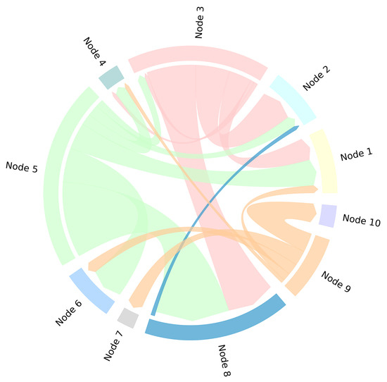 Figure 4 presents a chord diagram that displays the cumulative energy transfer within the decision cycle of the MESSs. The diagram provided a visual representation of the flow of energy transfer and its accumulation during the decision cycle. The direction of the arrows represents the flow of energy transfer. As depicted in the figure, some nodes were designated as primary charging nodes, such as nodes 3 and 5, while others served as primary discharging nodes, such as nodes 1 and 8. This was because these nodes, such as 3 and 5, possessed abundant renewable energy sources, which was a result of their geographical locations and other contributing factors. However, when these nodes were not connected to the MESSs, the surplus of renewable energy resources could lead to issues such as excess light or wind. By incorporating these nodes into the MESSs, the proportion of thermal power output was significantly reduced, thus improving the utilization of renewable energy sources. Some nodes, such as nodes 3 and 8, served as both supply and demand nodes, which was due to the intermittent nature of renewable energy and the mismatch between the supply of renewable energy and the peak demand for electricity. For example, the power generation capacity of PV was related to factors such as sunlight duration and weather and reached its peak output during sunny afternoons, but the local demand may not be able to consume all the generated electricity during this time period. Therefore, the excess electricity would then be transported to nearby nodes to meet the electricity demand of other nodes. In the evening, when the power output of PV decreased, a hydroelectric power supply from neighboring nodes could be required.