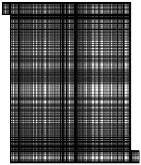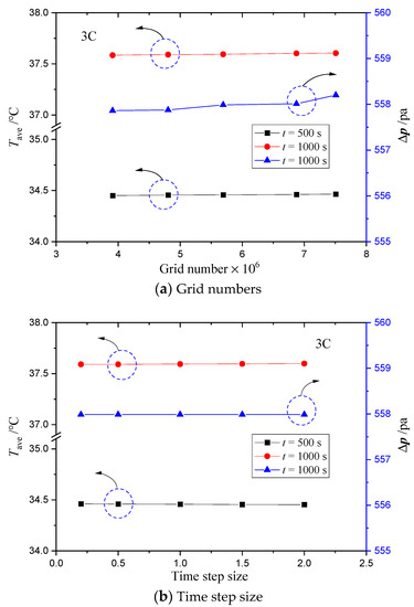 A structured hexahedral mesh was used in the numerical simulation. For illustration purpose, the front view of the grids is shown in Figure 4. Prior to the numerical simulation, a mesh independent test was conducted on cold plate D1 with six different mesh sizes. In this test, the Reynolds number at the inlet channel was set as 500 and the discharging rate was set to be 3C. The total number of cells was increased from 3,900,000 to 7,500,000 and the non-dimensional distance y+ between the first interior node and solid wall was set in the range of 2 to 4.8. Figure 5a shows the average battery temperature of design D1 at time t = 500 and 1080 s as well as the pressure difference between the inlet and outlet at t = 1080 s calculated in the mesh independent test. The results indicate that the deviations between the average battery temperatures obtained with different grid numbers was less than 0.1 °C at t = 500 and 1080 s. Meanwhile, the difference in the pressure drop was less than 0.5 Pa when using different mesh sizes. To balance the computational cost and accuracy, a cell number of 5,690,000 with y+ = 3.0 was finally selected for the computational analysis of cold plate D1. Similar steps have been followed to determine the mesh size for the analyses of other cold plate designs. Furthermore, a time-step independent study has also been performed to ensure that the time step used in the computational analysis is small enough to capture the transient thermal response of the BTMS accurately. The time step ∆t was increased from 0.2 to 2.0 s and the results are shown in Figure 5b. It is evident that changing the time step has negligible impact on the average battery temperature and pressure drop. Therefore, a time step of 1 s was selected for the computational analysis of all cold plate designs in this study.