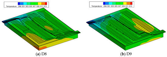 The dilemma between a greater number of cooling channels and a smaller flow rate in each individual channel can be overcome by introducing the concept of cross-linked channel configuration, which includes two hierarchical levels of interconnected channels. The coolants were first distributed in long and wide parallel longitudinal channels and subsequently routed into short and narrowly spaced transverse channels. Such a design not only allows a greater surface area to be exposed to the convective cooling liquid, but also ensures a sufficiently high heat transfer coefficient in the transverse cooling channels. As shown by Figure 8, the surface temperatures of the battery and aluminum plate obtained for cold plate designs D8 and D9 are significantly lower and more uniform than those obtained for designs D1 to D7. The highest temperature of design D8 was observed in the lower left corner, while that of design D9 was observed in the middle right region. The corresponding maximum surface temperatures of designs D8 and D9 are 38.5 °C and 38.4 °C, respectively. These results demonstrated that the cross-linked channel cold plates have a superior cooling performance than the Z-type parallel channel cold plates.
