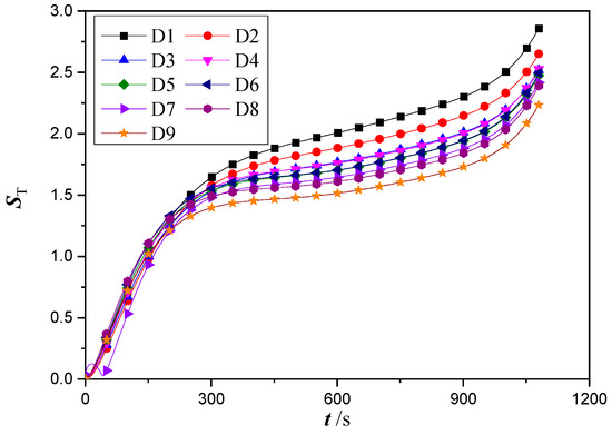 Non-uniform temperature distribution has a significant impact on battery performance and lifetime. To analyze the nonuniformity of temperature distribution for different designs, we calculated the variation of the temperature maldistribution parameter over time according to Equation (1) for different cold plate designs as shown in Figure 10. The change of the temperature maldistribution parameter was found to follow a similar trend with that of the average battery temperature. In particular, the temperature maldistribution parameters first increase rapidly, followed by a gradual and slow rise and finally increase quickly again near the end of the discharging process. Among all the designs, D9 has the smallest temperature maldistribution parameter during most of the discharging process. Thus, it can be concluded that design D9 has the best thermal performance than the rest of the designs in terms of both the thermal resistance and temperature uniformity.