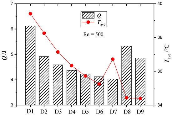 where Δp is the difference between the inlet and outlet pressure, V is the volumetric flow rate of the cooling medium, and t is the operating time of the cold plate. Figure 11 shows the energy consumption and the average temperature of the battery when the discharging cycle completed (t = 1080 s) for comparing the integrative performance of different designs. The inlet Reynolds number was kept constant at Re = 500 and the batteries were operated at a discharge rate of 3C. Because the fluid properties are independent of the temperature, the pressure and velocity distribution remained constant during the entire discharge process. Therefore, the pressure values obtained at the end of discharging (t = 1080 s) were used to calculate the pumping power. As shown in Figure 11, the power consumption kept decreasing monotonically with increasing number of channels in the Z-type parallel channel cold plates. This is because increasing number of channel numbers results in a lower mass flow rate in each channel, which reduces the pressure drop through each individual channel. Considering that the total pressure drop across the parallel channel system is equal to that across each single channel, the total energy consumption can therefore be reduced by distributing the cooling medium into a greater number of channels. The minimum power consumption was obtained in design D7 which contains nine branches of parallel channels. Furthermore, the cross-linked channel cold plates, due to their longer, narrower, and more tortuous flow path, require a significantly higher pumping power to achieve the same flow rate compared with cold plates containing Z-shaped parallel channel. However, by adjusting the structure of the cross-linked flow path slightly from design D8 to design D9, the total power consumption can be reduced by more than 20% without significant impact on the cooling performance. Therefore, based on the comprehensive consideration of the thermal-hydraulic performance, cold plate designs D6 and D9 were identified as the optimum channel designs in this study.