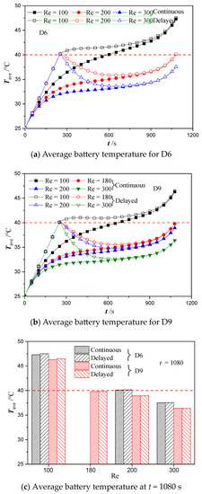 Figure 12c shows the battery temperature in cold plate designs D6 and D9 under both cooling strategy when the discharging cycle completed (t = 1080 s). At the same flow rate, the battery temperature in cold plate design D6 is always higher than that in design D9. In addition, there is very marginal change in the average battery temperature when changing from the continuous to the delayed cooling strategy. The average temperature of the battery at the end of the discharging process is 40.1 °C at Re = 200 in design D6 and 39.8 °C at Re = 180 in design D9. These results suggest that the battery temperature can always be controlled within a safe limit by either operating cold plate D6 at Re = 200 or cold plate D9 at Re = 180 under both cooling strategies.