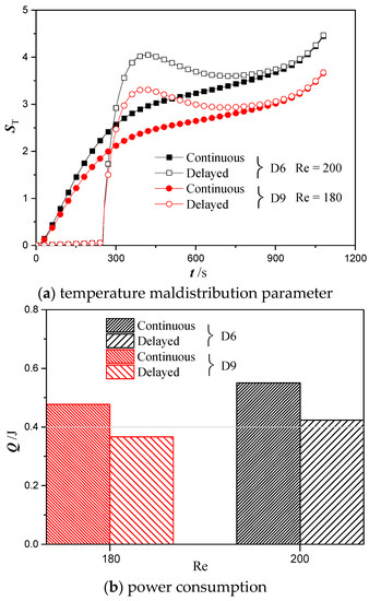 Figure 13 shows the temperature maldistribution parameter and power consumption for cold plate design D6 at Re = 200 and design D9 at Re = 180 when adopting the two different cooling strategies. Similar to the trend observed for average battery temperature, the temperature maldistribution parameter kept increasing over time under the scheme of continuous cooling. However, when switching to the delayed cooling strategy, the temperature maldistribution parameter remained almost zero during the initial period due to the zero flow rate of the coolant. Subsequently, the battery temperature reached the upper limit and the coolant started being pumped into the cold plate, which resulted in a large temperature difference between the entrance and exit areas. This stage is represented by a sharp rise of the temperature maldistribution parameter shown in Figure 13a. As the coolant got heated up by the battery, the temperature maldistribution parameter experienced a slow drop followed by a gradual rebound towards the end of the discharging process. As shown in the results, the temperature maldistribution parameters of design D6 is always greater than that of design D9 regardless of the cooling strategy being employed. In addition, the power consumption of design D9 is also 13% lower than that of design D6. More importantly, changing from the continuous to the delayed cooling strategy allows the power consumption to be reduced significantly due to the temporal interruption of the cooling flow. In particular, the power consumption was decreased by 23% for both designs D6 and D9 after switching from the continuous to the delayed cooling schemes. All these findings demonstrate that the delayed cooling strategy is a more energy efficient method to control the battery temperature within a safe operating limit compared to the continuous cooling strategy. Furthermore, design D9 was proven to have the best cooling performance than the rest of the designs in terms of a lower battery temperature, a smaller temperature non-uniformity, and a lower power consumption.